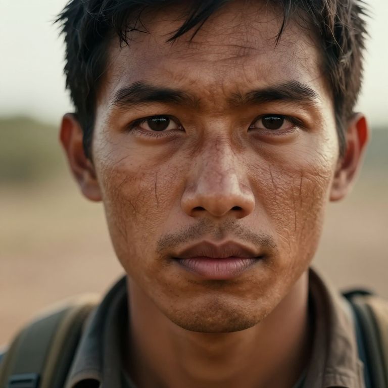 A captivating portrait showcasing an intrepid adventurer's rugged features and strong jawline on tanned skin. The unconventional 'bug's-eye view' perspective reveals intricate lines etched by time across their face, highlighting a piercing gaze that tells tales of distant lands explored and challenges overcome. Soft, warm light bathes the subject from above, casting gentle shadows to evoke awe and admiration for their journeys.