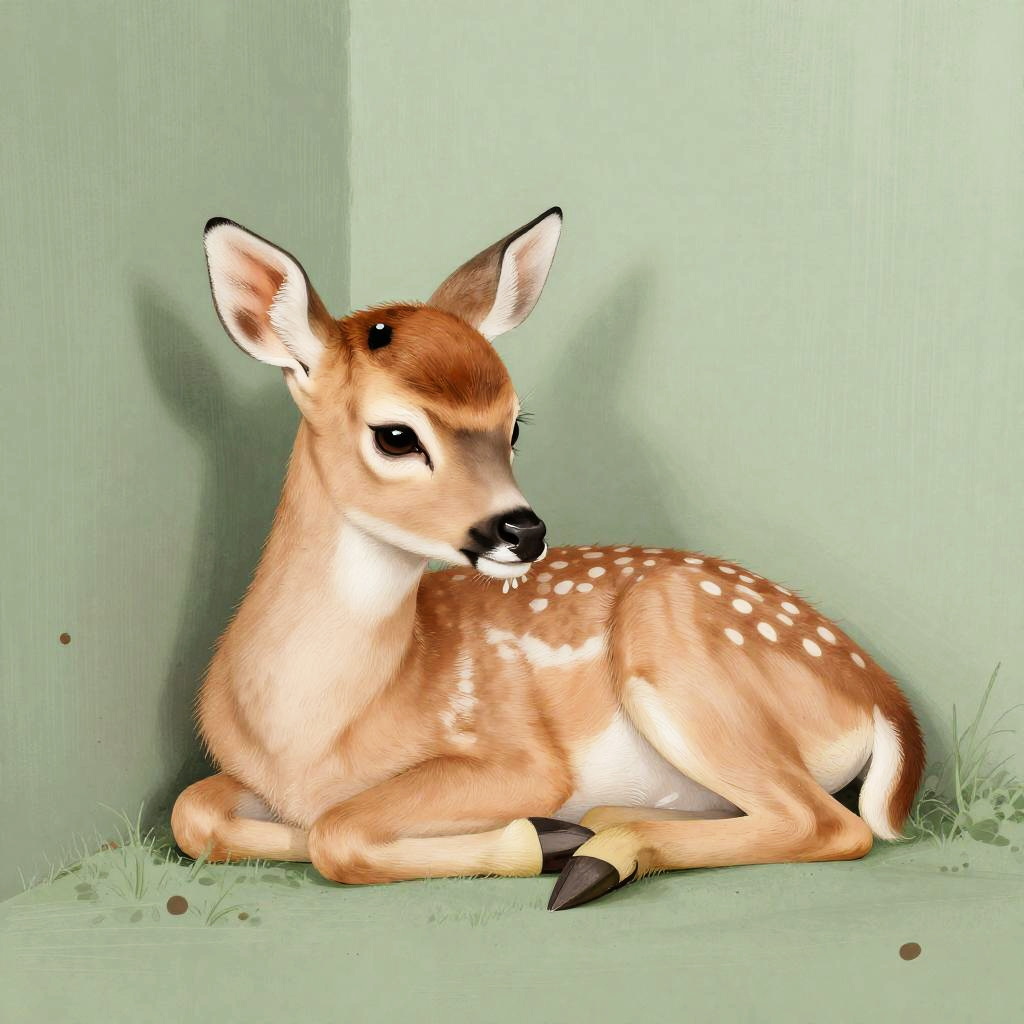 Illustration of a gentle fawn with soft eyes, laying in the corner of a wall. Rendered in the style of sage green and pale peach, influenced by Konstantinos Parthenis and Louis Majorelle, featuring surreal yet realistic textures and emotional depth.