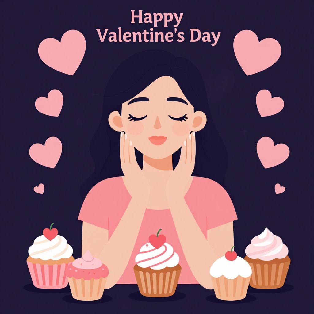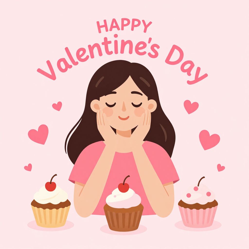 Happy valentines day, young woman with sweet cupcakes with hearts vector