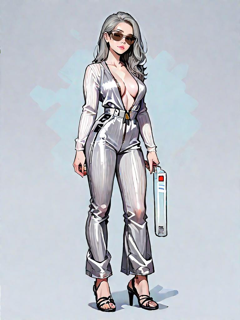 1girl, source_comics, realistic face, full body shot, Woman, bodycon fashion, grey ribbed jumpsuit, long-sleeve, zipper front with plunging neckline, form-fitting, ankle-length trousers, transparent high-heeled sandals, oversized sunglasses, holding a face mask, light grey marble-like studio background.