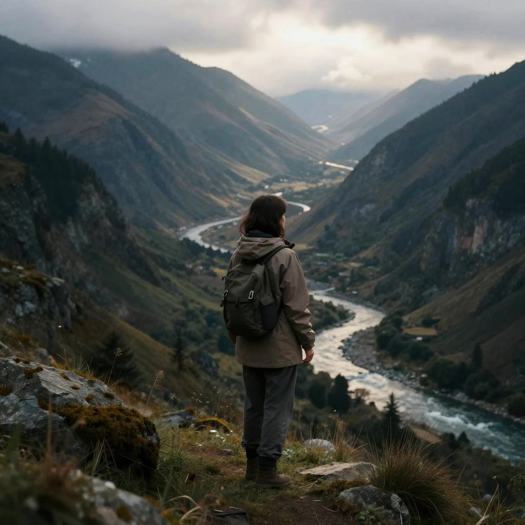 Photograph of a lone hiker standing on a rocky, grassy mountaintop, facing a winding river valley. The hiker, wearing a beige jacket, gray pants, and a gray backpack, has dark brown hair. The background features steep, forested mountains with a river snaking through the valley, partially shrouded in mist. The sky is overcast, with bright white light breaking through the clouds, illuminating the valley below. The hiker's back is to the camera, creating a sense of solitude and reflection in this rugged, natural landscape.