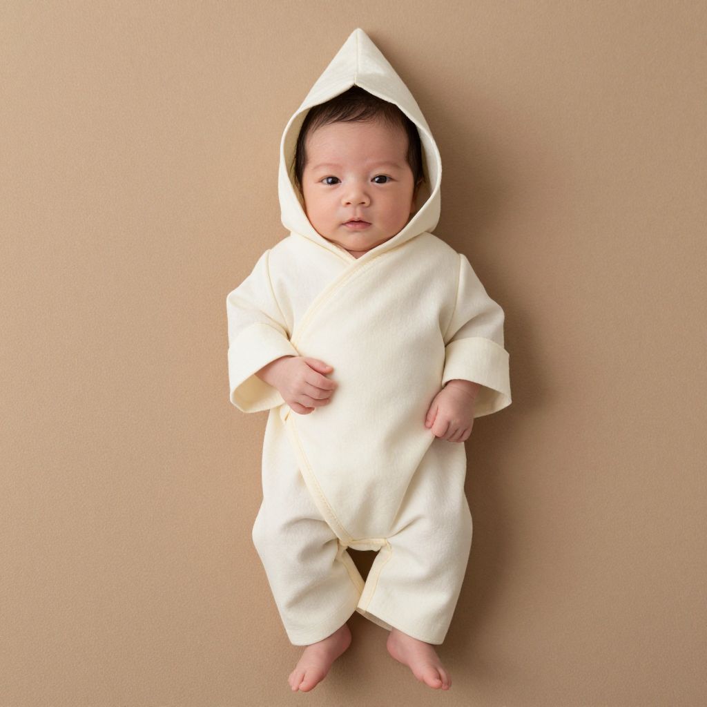 Photograph of a baby with fair skin and dark hair, wearing a cream-colored hooded onesie against a plain beige background. The onesie is loose-fitting, with a pointed hood and long sleeves. The baby stands barefoot, with one hand gently touching the front of the onesie and the other resting at their side. The baby's expression is neutral, and they gaze directly at the camera. The lighting is soft, highlighting the smooth texture of the onesie and the baby's delicate features. The overall composition is simple and centered, focusing on the baby.