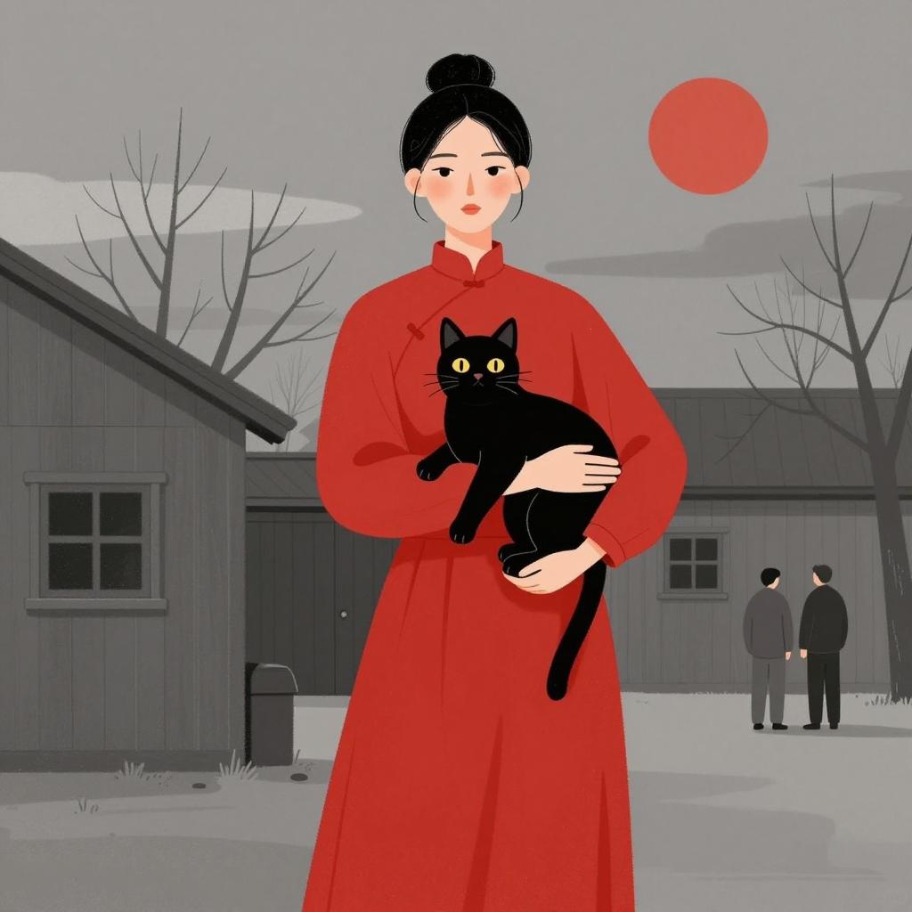 Illustration of a pale-skinned woman with a black bun, wearing a long, bright red dress, standing next to a black cat. She holds the cat against her hip. Background includes a gray, wooden building with windows and leafless trees. A red sun is in the cloudy sky. The woman has a neutral expression. Two people.