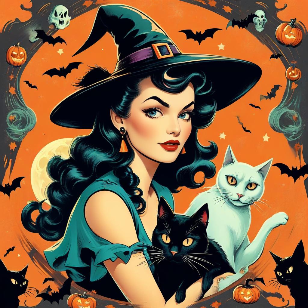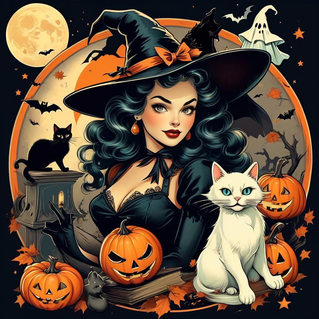 Pin-up witch with vintage illustration colors, Halloween theme, surrounded by ghost, black cat, witch hat, cute retro clip art style