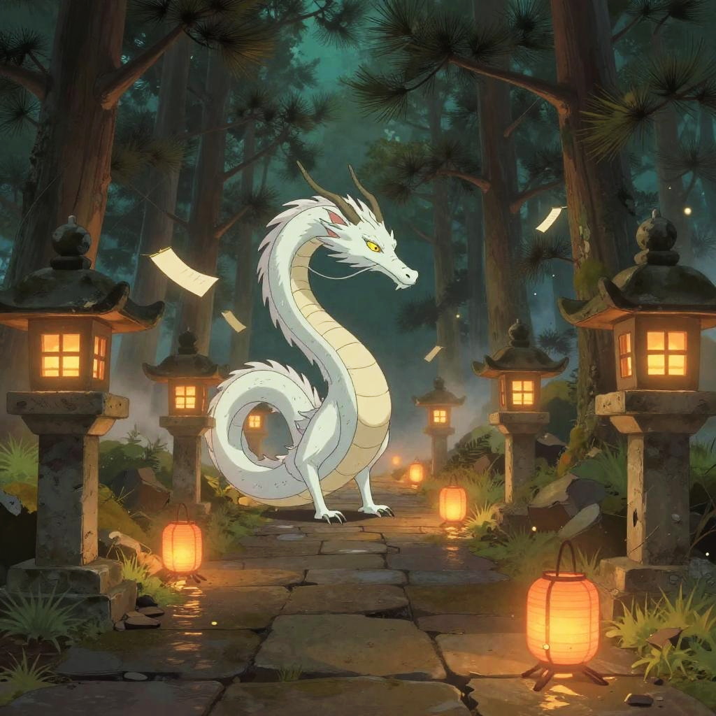 Spirited Away-inspired fantasy at a crumbling stone lantern path amid pine trees; a mystical white dragon coiled gently stands amid glowing lanterns and fluttering paper talismans. ethereal cel-shaded fantasy art aesthetic with delicate linework, soft edges, and subtle washi texture. Cinematic composition with leading lines and a clear vanishing point, cool blue and violet grading, volumetric light, gentle fog, soft bokeh, polished wood reflections, high detail, subtle film grain, calm, wistful mood.