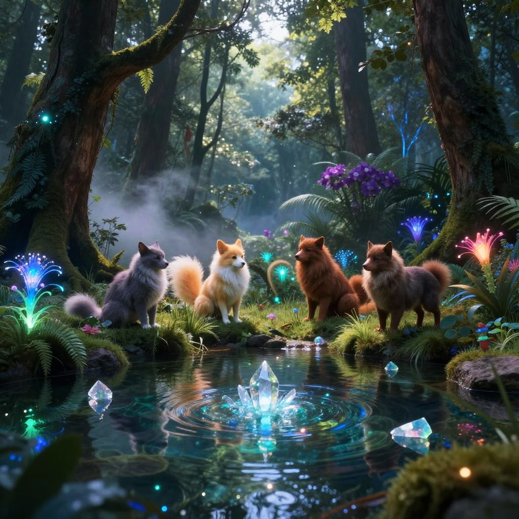 Magical woodland creatures gathering near a shimmering crystal-clear pond in a mystical forest with bioluminescent plants and ethereal mist, vibrant colors