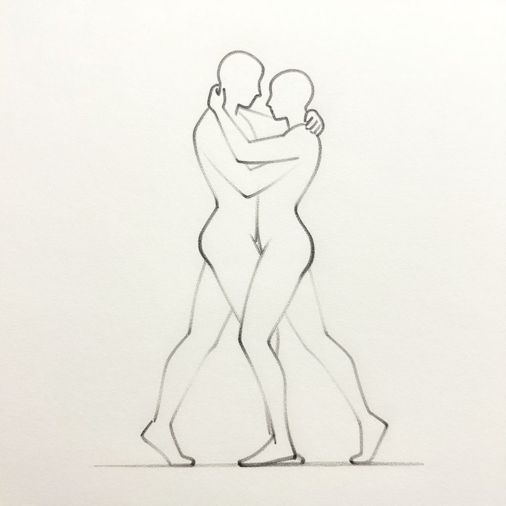 2 person drawing base showing two human silhouettes intertwined in an artistic embrace, minimalistic line art with simplified anatomy, smooth contours, and flexible posture options for creative character design and storytelling.