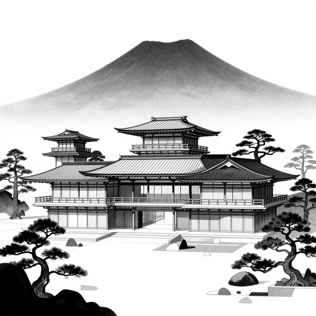 This black-and-white digital drawing depicts a traditional Japanese castle with multiple tiered roofs and wooden beams, situated in front of a large, cone-shaped mountain. The castle has multiple stories and is surrounded by meticulously pruned pine trees and small rocks. The background is stark white, emphasizing the contrast with the black and grayscale details of the castle and trees. The style is reminiscent of Japanese ukiyo-e woodblock prints, characterized by clean lines and a minimalist approach. The image balances architectural precision with natural elements, creating a serene and composed scene.