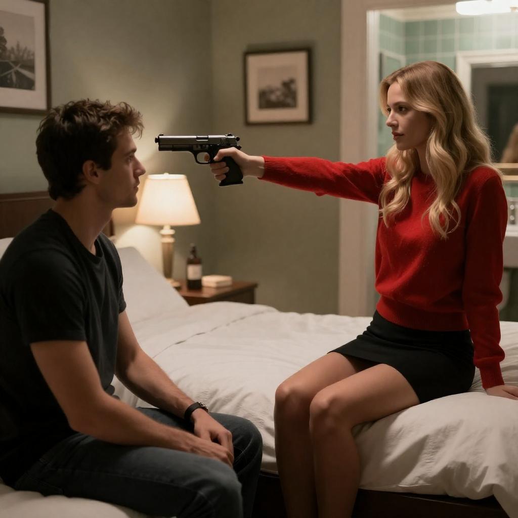 Illustration of a man with short brown hair, wearing a white shirt, focusing intently on a candle lighter. A blonde woman with loose hair, wearing a white dress, stands behind him. Both figures have intense expressions. A large, ornate, circular brown object is in the background. The man is positioned in the lower center, the woman in the upper right. Warm, golden hues dominate the color palette.