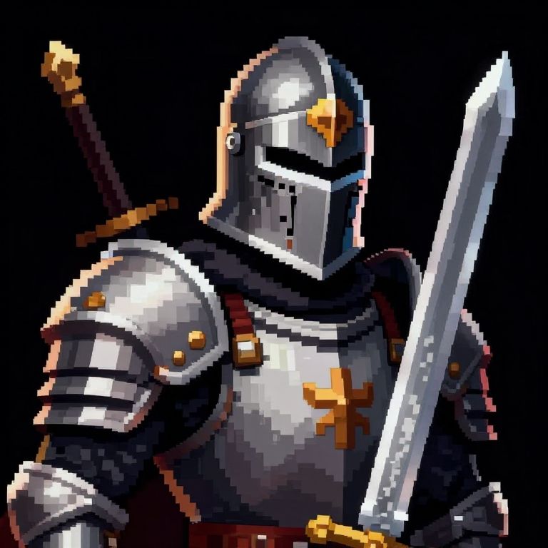 Pixelgrafik portrait of a warrior in pixel art style armor, detailed pixel shading, medieval fantasy theme, intricate pixel design of sword and helmet, dramatic lighting highlighting helmet reflections, 16-bit pixel art quality, vibrant color palette.