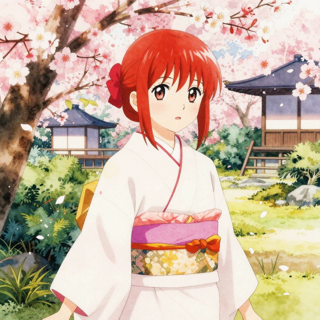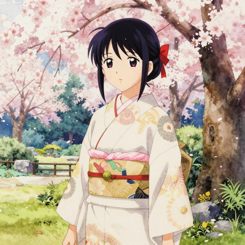 Anime Girl in Kimono with Cherry Blossoms