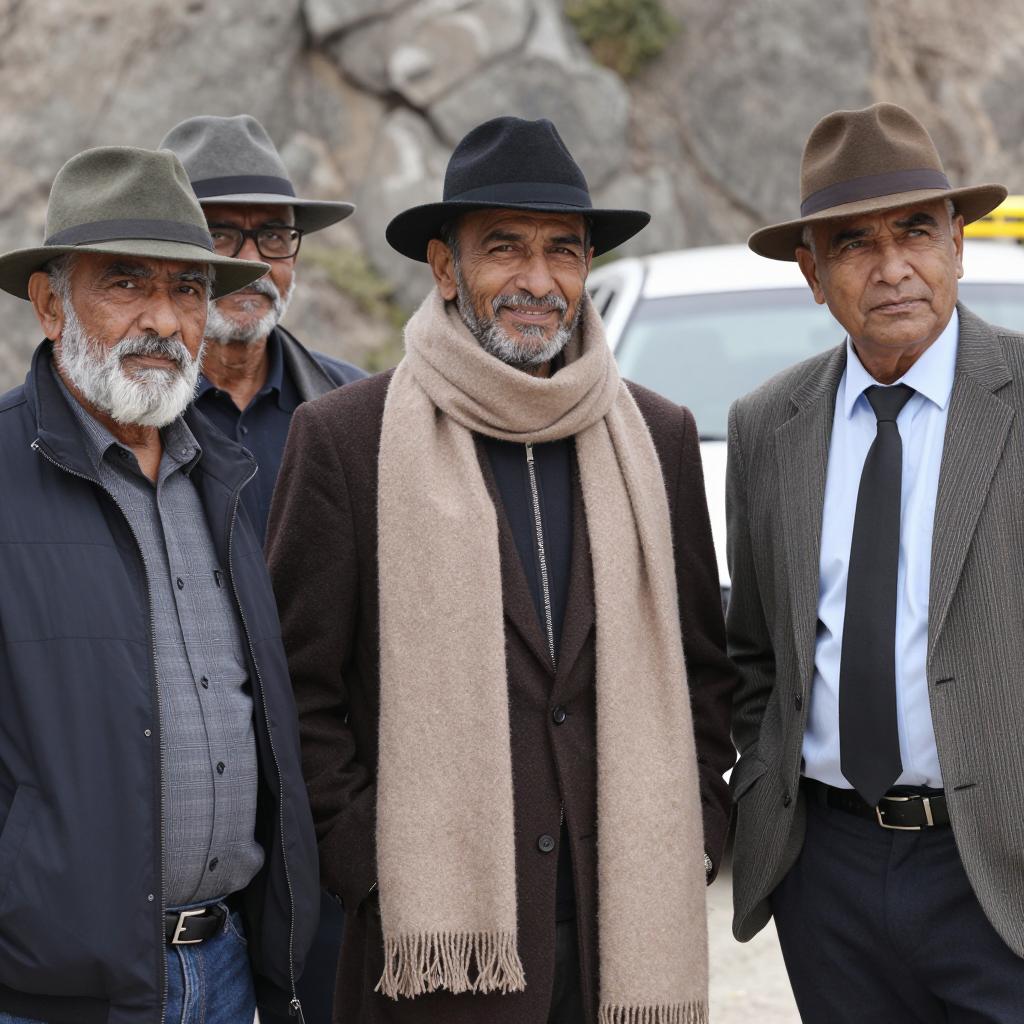 Four older men standing outdoors, wearing hats and layered clothing. Two men on the left have beards, one with glasses. Center man smiles, wearing a beige scarf. Right man with striped jacket and black tie. Background includes rocky terrain and blurred objects. Men in front lean slightly towards each other.