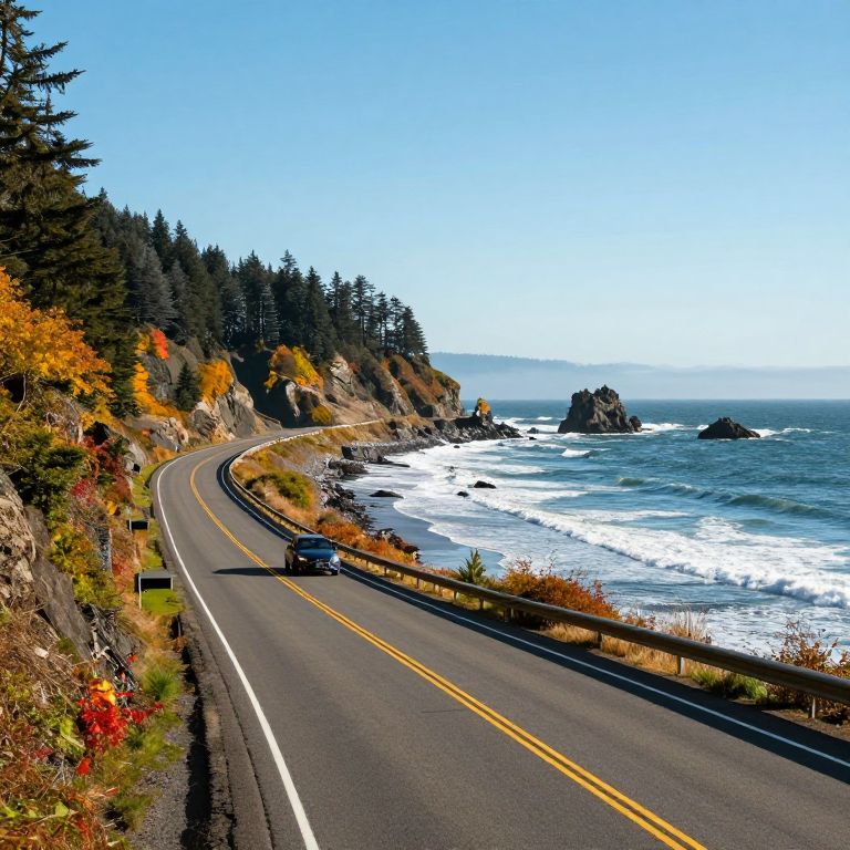 Line Art scenic coastal highway in the pacific northwest, a single car on the road, windswept ocean, autumn foliage,