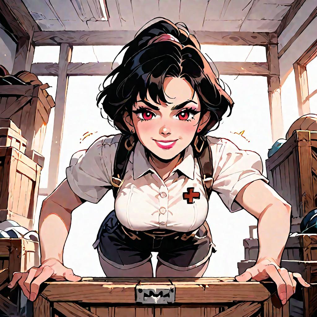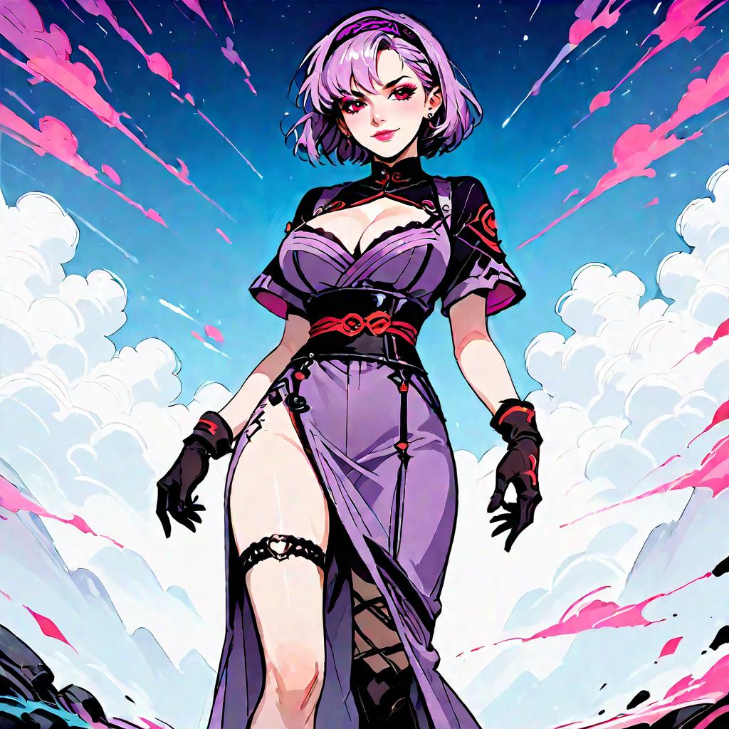 Score_9, score_8_up, score_7_up, score_6_up, rating_questionable, source_anime, red hair, ponytail, red eyes, [long eyelashes], (smug smile), 1girl, solo, full body, breasts, reaching towards viewer, white jacket, white skirt, black thigh boots, black elbow gloves, midriff, red "R"sky, clouds