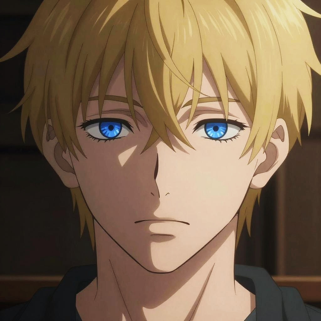 Aot blonde hair guy with piercing blue eyes, close-up portrait, intricate hair strands, sharp shadows, mysterious background, highly detailed anime style, emotional intensity