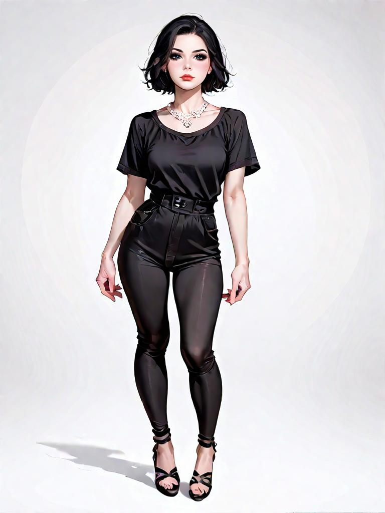 1girl, source_comics, realistic face, full body shot, Woman, minimalist chic, sleeveless navy romper, keyhole neckline, short hem, black ankle boots with low heel, wide-brimmed hat, plain gray studio background