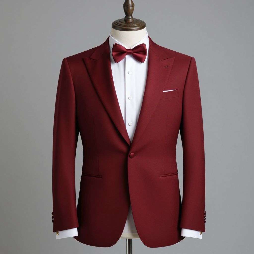 Photograph of a dark maroon tuxedo with black lapels, white dress shirt, and matching maroon bow tie, set against a white