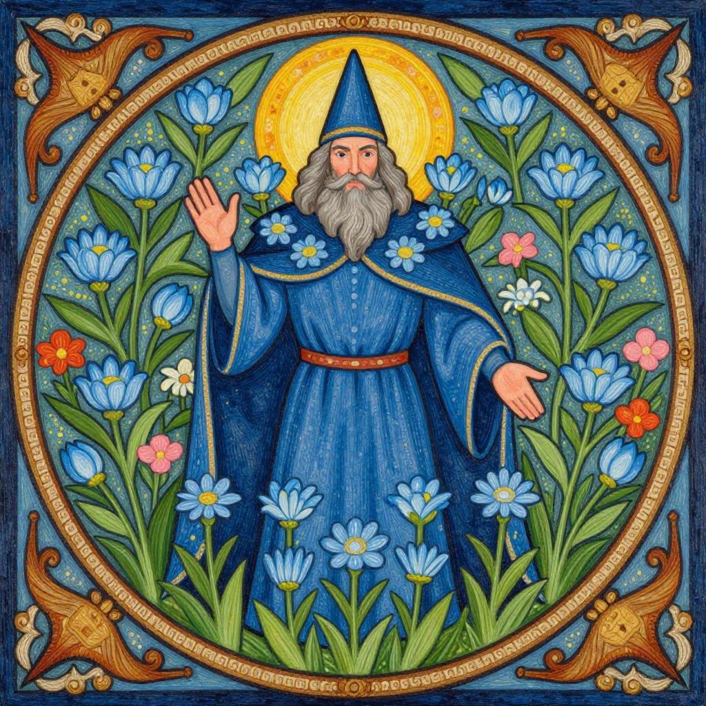 Colorful artistic representation of Dagda, the Celtic god of fertility, wisdom, and magic. The figure is depicted as a grand bearded man wearing a blue robe and pointed hat, with blooming blue flowers radiating from his cloak. The background features a detailed floral and bird motif enclosed in an ornate circular frame, symbolizing nature and abundance.