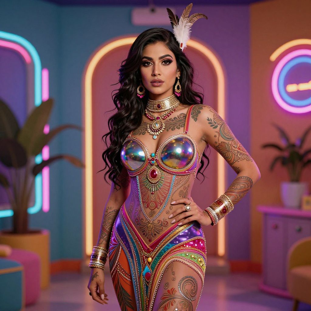 Photograph of a stunning woman with long, wavy black hair, wearing an intricate, colorful, and reflective bodysuit that reveals her large, circular, mirrored breast covers. She has extensive tattoos on her arms and chest. She accessorizes with gold jewelry, including a headpiece with a white feather, large hoop earrings, a necklace, and several bracelets. The background features neon pink and blue arches, a potted plant, and a pink cabinet, creating a vibrant, retro-futuristic setting. The lighting highlights her confident, alluring pose.
