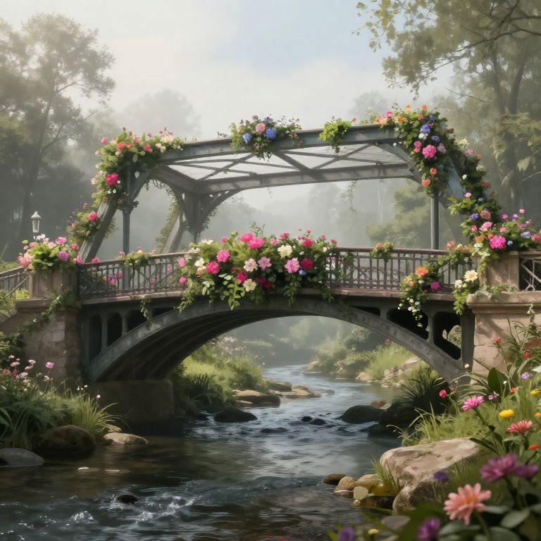 Photorealistic digital artwork of an iron bridge adorned with vibrant flowers, spanning a gentle, rocky river in a sunlit, misty forest.