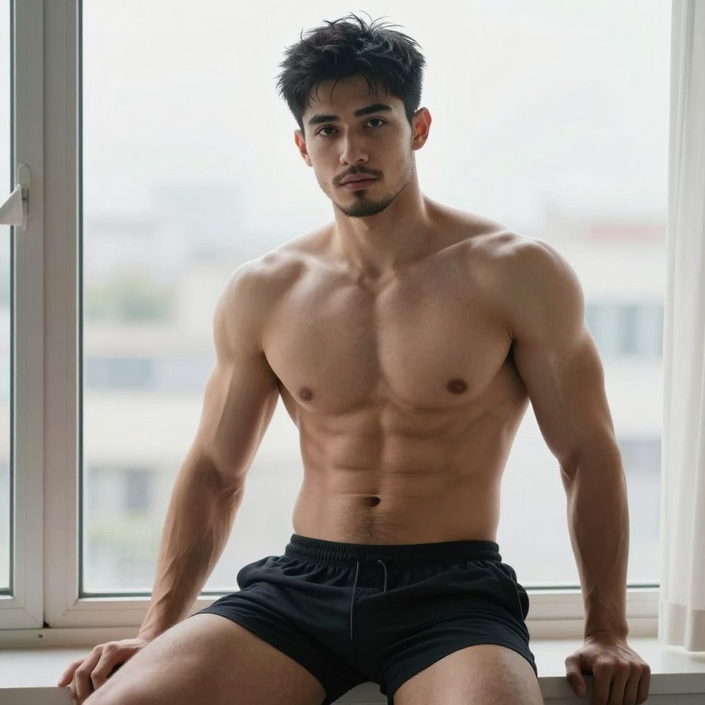 Masterpiece, best quality, 1boy, muscular, brown eyes, black hair, shorts, pose, short hair, indoors, window, beard