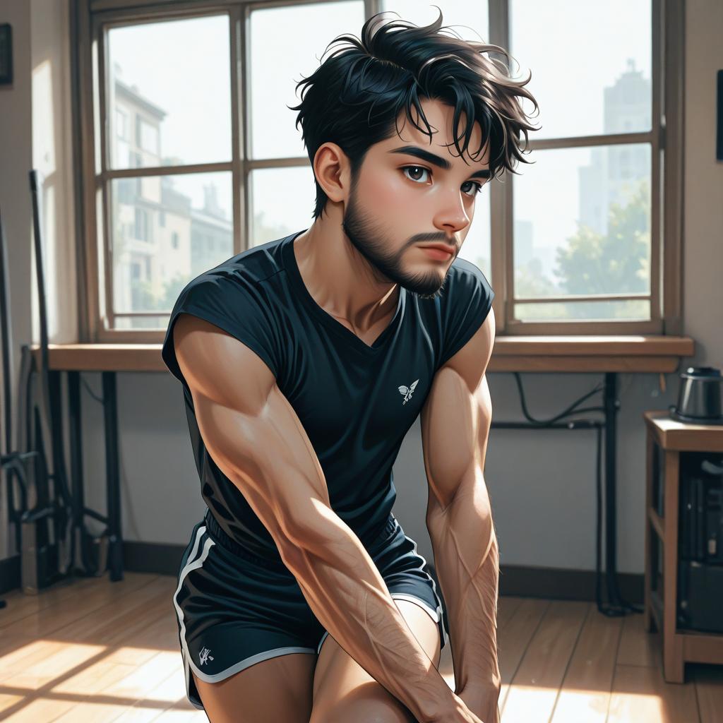 This is a digital illustration of a muscular young man with light brown skin, black messy hair, and a trimmed beard, sitting in a sunlit room. He wears a black, short-sleeved t-shirt and black gym shorts with white trim. His well-defined biceps and triceps are prominently displayed. The background features large windows with bright sunlight streaming in, casting shadows on the wooden floor. There's a wooden table with a metal stand and a small pot on the right side, and a black metal frame is visible on the left. The style is realistic with a slight anime influence.