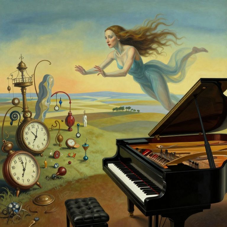Craft an image in the surrealistic style reminiscent of Dali's dreamscapes. Depict an enigmatic figure emerging from an open grand piano, soaring towards the viewer as if defying gravity. From an overhead viewpoint, a whimsical landscape unfurls beneath this otherworldly scene, where timepieces and miscellaneous objects appear to be flowing into one another in a harmonious fusion of forms. The ethereal being extends her translucent hands towards the audience, skillfully playing an intangible symphony in midair, invoking both tranquility and mystique within this mesmerizing dream realm.