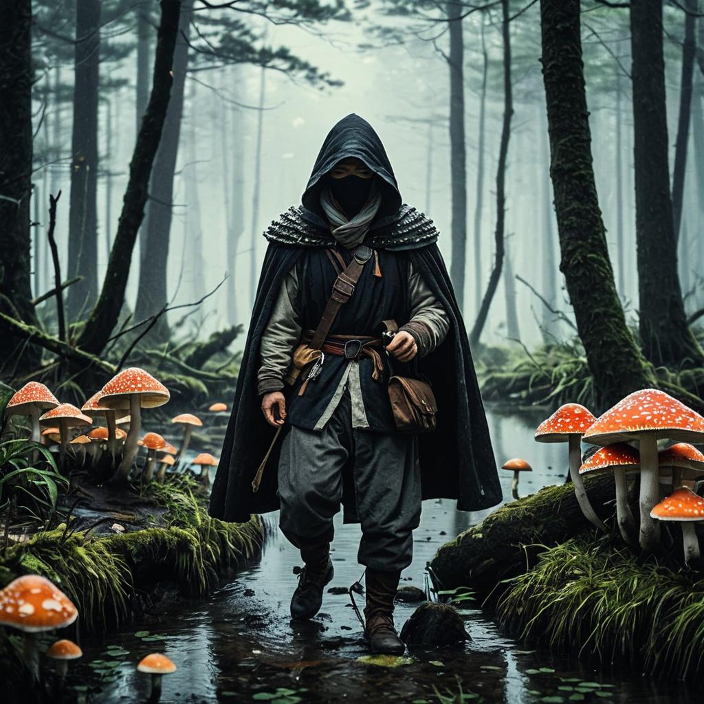 An agile bandit, wearing a rugged traveler's cloak, practicing in a misty swamp, surrounded by glowing mushrooms, drawn in the serene and character-focused style of Nobuhiro Watsuki.