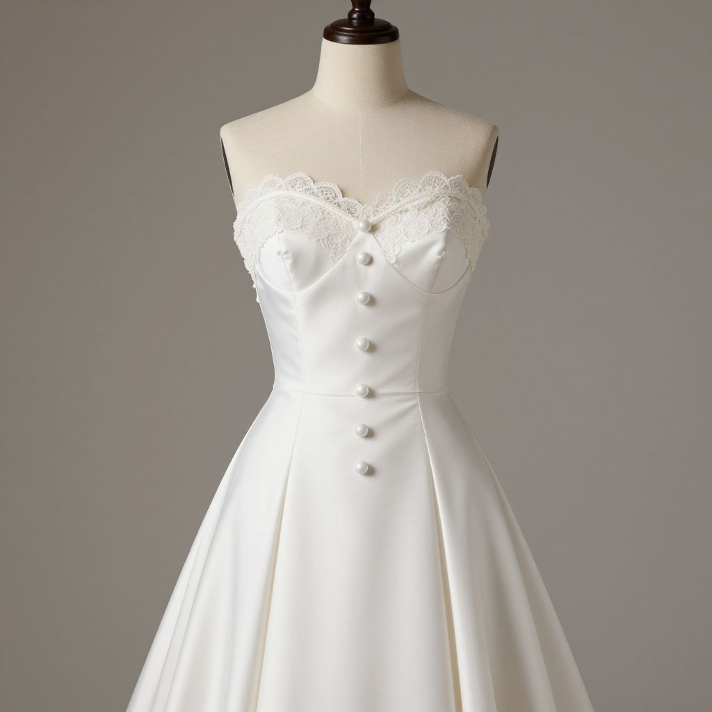 Elegant 1950s-inspired wedding dress featuring a sweetheart neckline, lace trim details, and a fitted bodice with five decorative buttons, showcased on a mannequin in a minimalist setting.