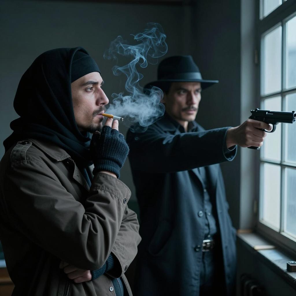 A man with dark hair, wearing a geometric patterned shirt, smokes a cigarette in a dimly lit movie theater. His eyes are closed, inhaling smoke. Background shows blurred people, including a woman in a white top and a man in a beige shirt, sitting and watching the movie. Bright light spot on the top left.