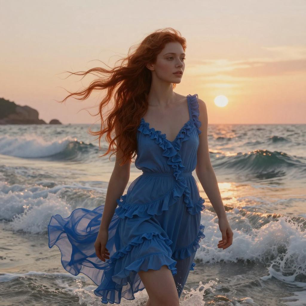 A digital painting of a beautiful, fair-skinned woman with flowing auburn hair, wearing a blue, ruffled dress that flutters in the wind. She stands in the ocean, with large waves crashing around her. The sunset in the background casts a warm glow, and a distant rocky shoreline is visible. Her expression is serene, and the overall scene is magical and ethereal.
