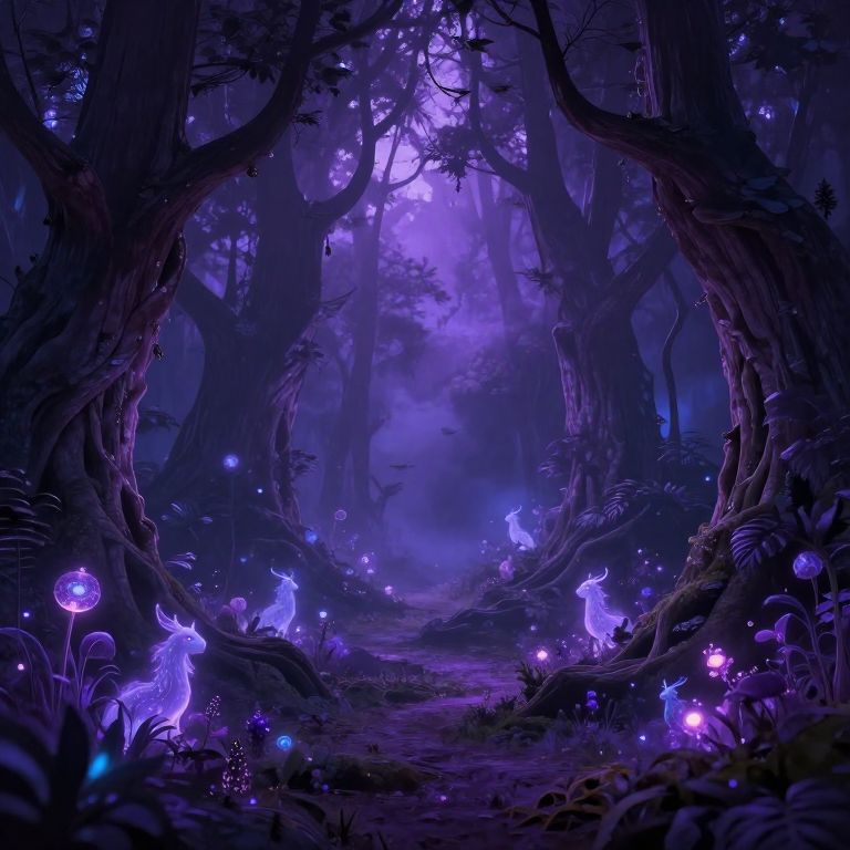 A digital fantasy artwork depicts a mystical forest bathed in vibrant purple and blue hues. Twisted, dark trees frame a narrow, glowing pathway. Bioluminescent deer with ethereal, glowing antlers and wings, and luminescent mushrooms dot the forest floor, emitting soft blue and purple light. Tiny, floating fireflies add to the magical ambiance. The background fades into a misty, purple-lit distance, enhancing the enchanted atmosphere. The texture of the trees is rough and gnarled, contrasting with the smooth, glowing creatures and flora. The scene evokes a sense of wonder and magic.