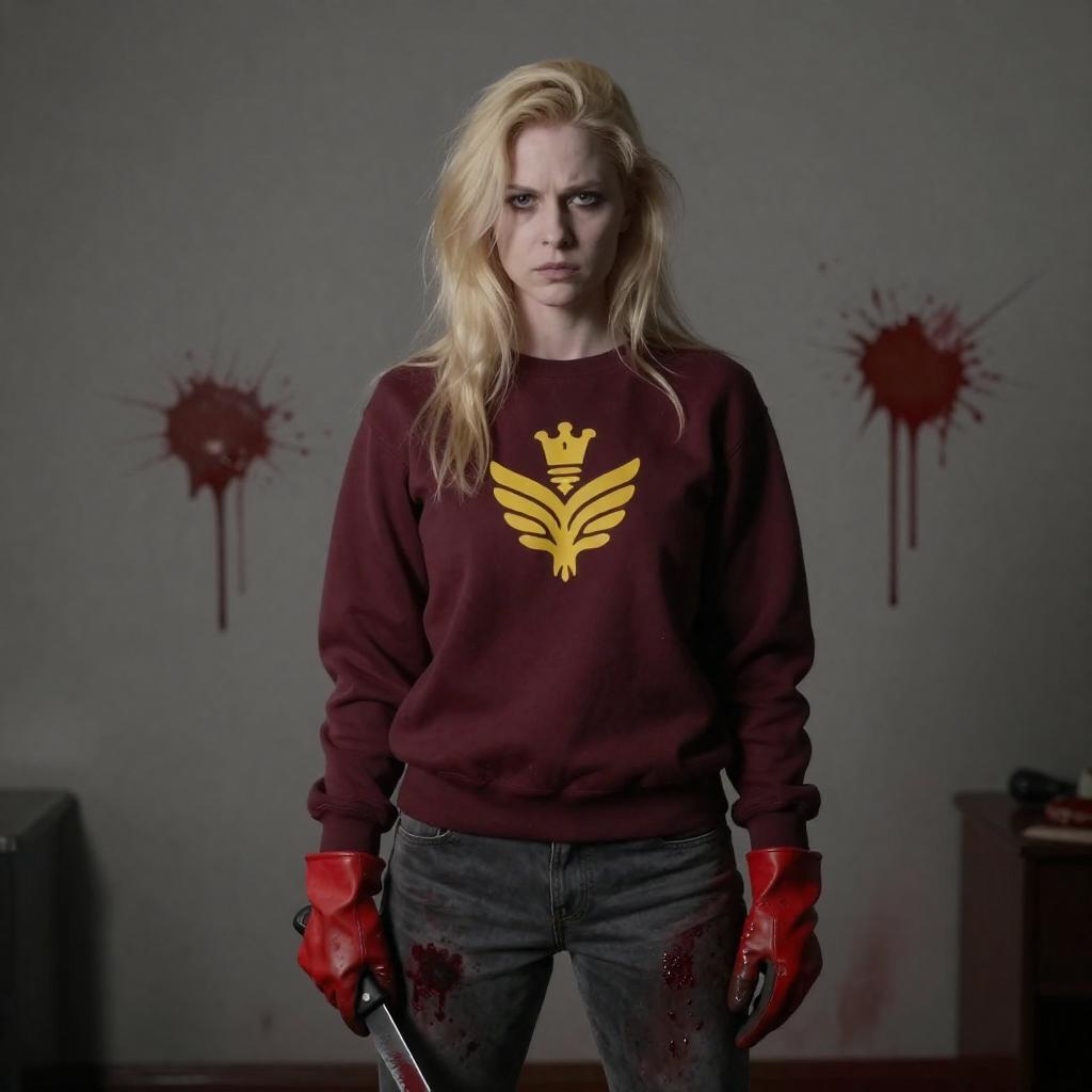 Photograph of a blonde woman with pale skin, wearing a maroon sweatshirt with a yellow emblem, blood-stained gray pants, and red gloves holding a bloody knife. She stands in a dimly lit room with a blood-splattered wall. Her expression is serious and slightly defiant.