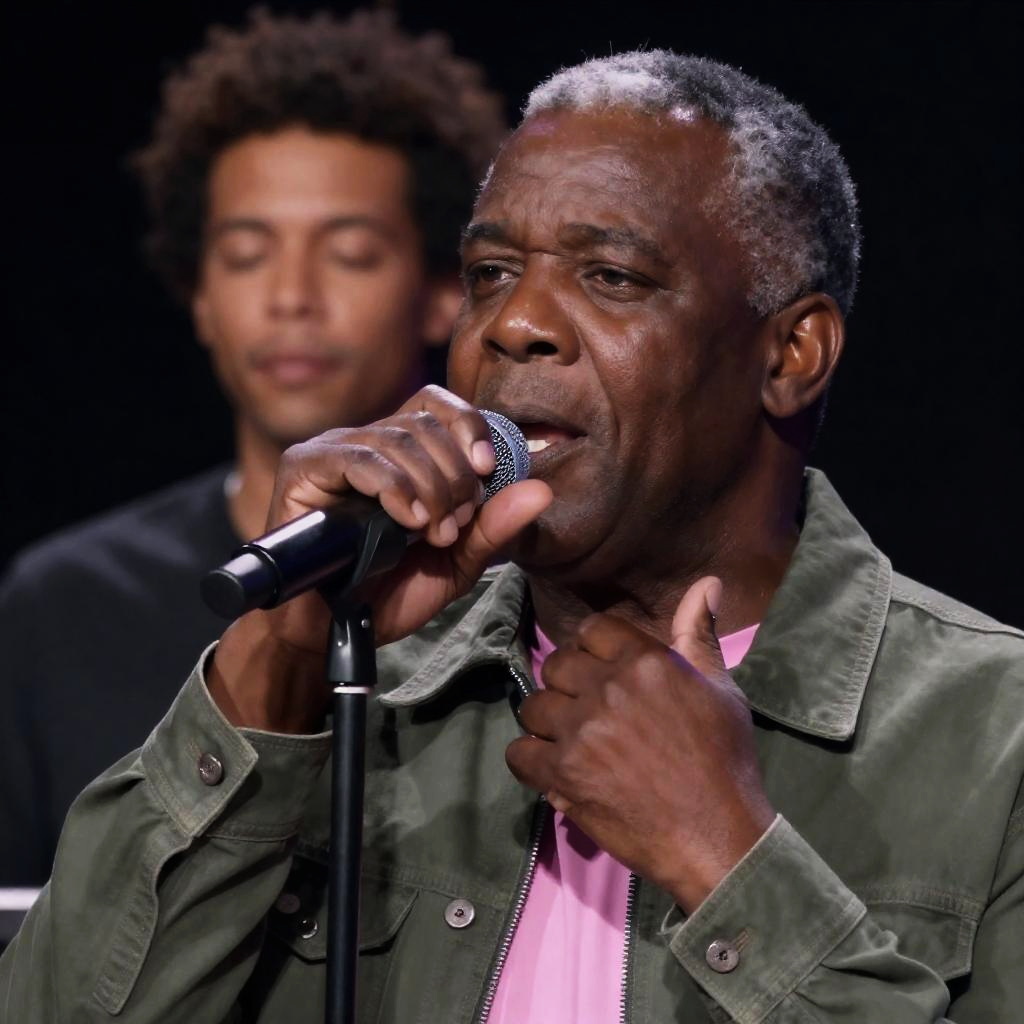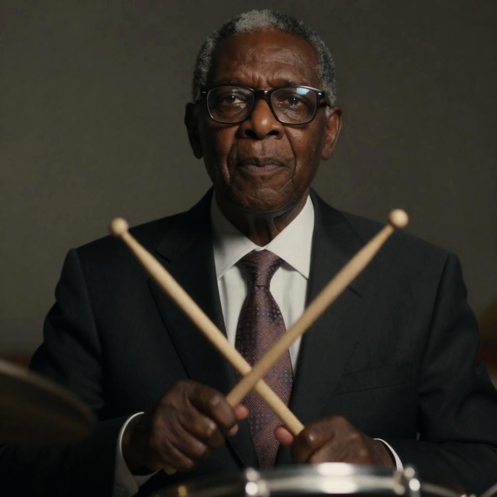 Photograph of an older African American man with glasses, wearing a black suit and patterned tie, holding drumsticks in front of his chest. Intense expression, dimly lit background with soft light flares. Focus on drumsticks in foreground.