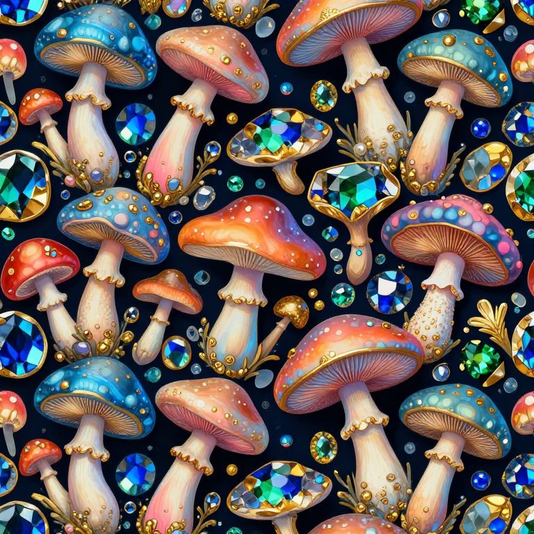 The image presents a mesmerizing 8k seamless pattern featuring a vibrant array of mushrooms and gemstones. The mushrooms, with their iridescent caps and stems, come in a variety of colors, including shades of blue, pink, and orange, interspersed with gold accents. They are scattered throughout the scene, some appearing larger and more prominent, while others are smaller and more subtle. The gemstones, in hues of blue, green, and gold, are interspersed among the mushrooms, adding a touch of opulence to the composition. The overall arrangement is dynamic, with mushrooms and gemstones overlapping and interacting in a seemingly random yet harmonious manner. The dark background contrasts sharply with the bright colors of the mushrooms and gemstones, making them stand out vividly. The pattern is meticulously crafted, with each element carefully placed to create a visually captivating and balanced composition.