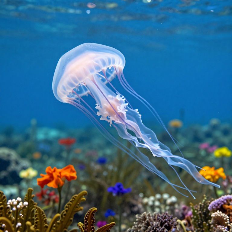 Jellyfish drift gracefully through a vibrant underwater meadow, their translucent bodies illuminated by sunlight filtering through the deep blue water, while colorful blooms and delicate sea plants flourish below.