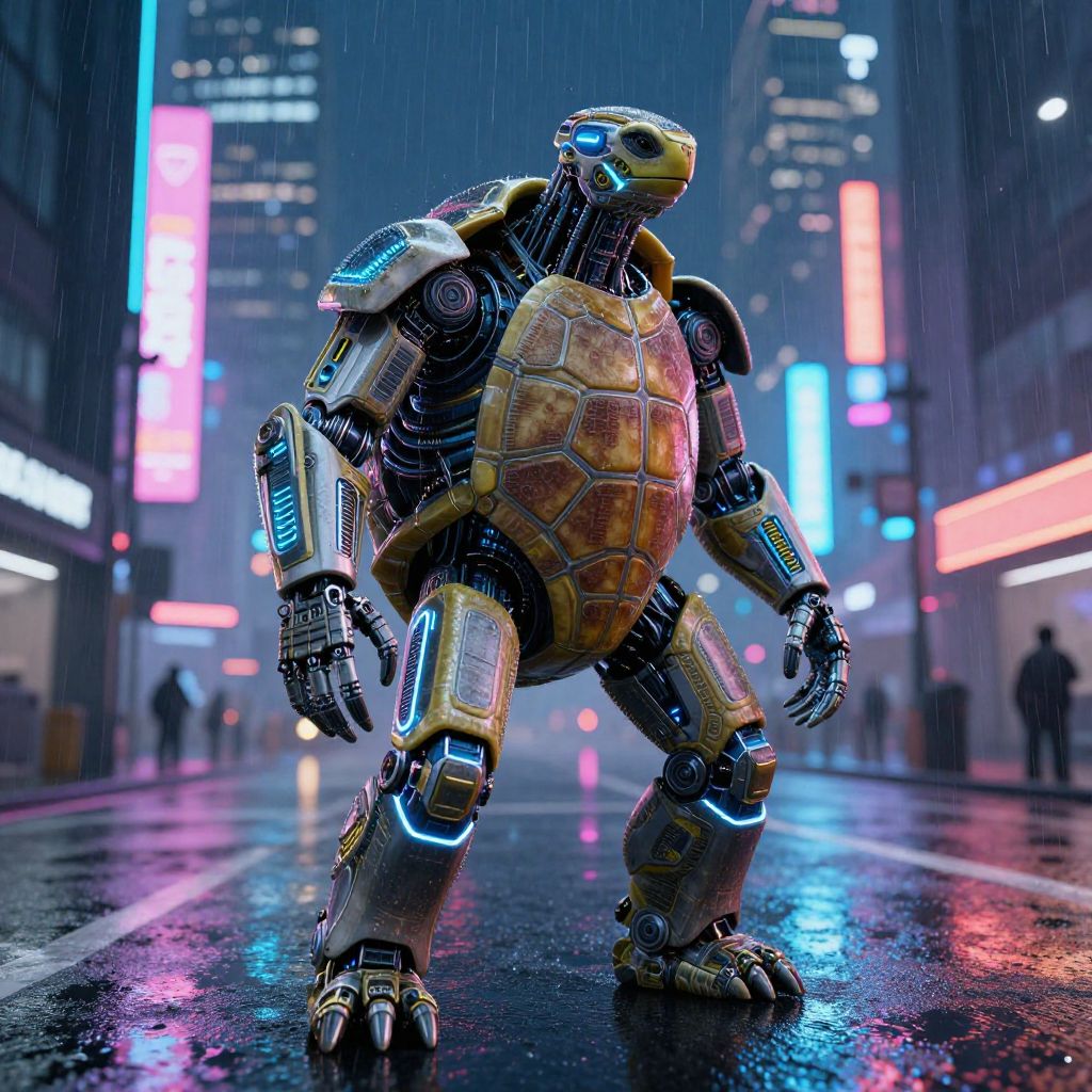 Futuristic human turtle hybrid biomechanical creature, enhanced with glowing cybernetic limbs and shell plating, standing in a neon-lit cityscape at night, rain-soaked streets reflecting colorful lights, a fusion of organic and robotic design in a cyberpunk art style.