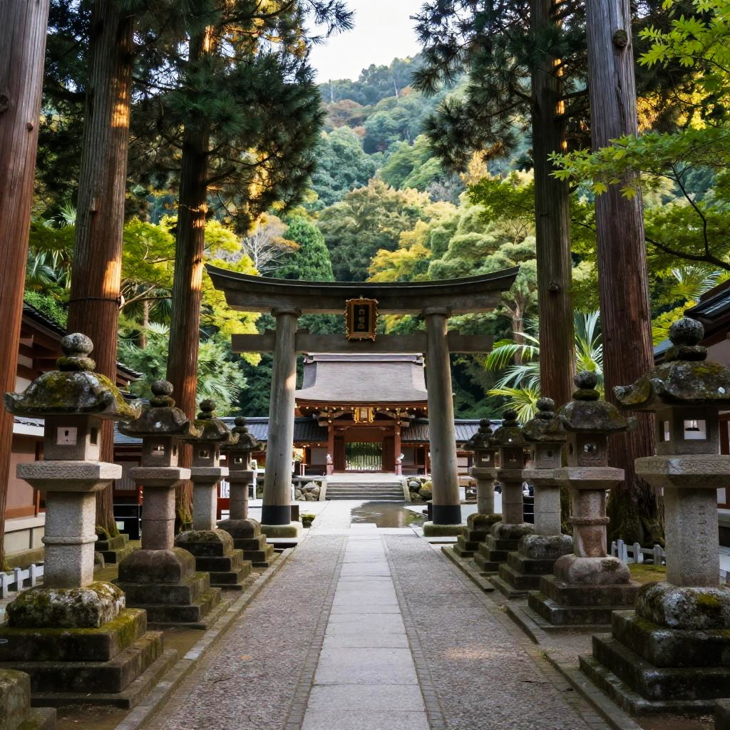 Amemiya, peaceful mountain shrine surrounded by lush green forests, stone lanterns lining the path, soft golden sunlight filtering through tall cedar trees, quiet river nearby, traditional Japanese torii gate, highly detailed landscape, tranquil and spiritual