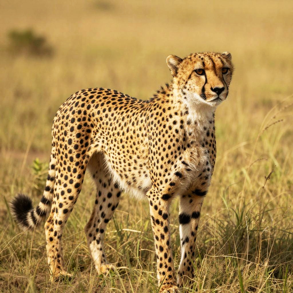 Photograph of a standing cheetah in a grassy savanna. The cheetah, with a sleek, muscular build, has a golden-yellow coat adorned with numerous black spots. Its tail is slightly curved, and its eyes are focused intently forward. The background is a blurred golden field with tall, dry grasses, suggesting a sunny, warm environment. The cheetah's fur is smooth, and its black tear marks run from the inner corners of its eyes down to its cheeks. The image is brightly lit, highlighting the cheetah's striking pattern and alert posture.