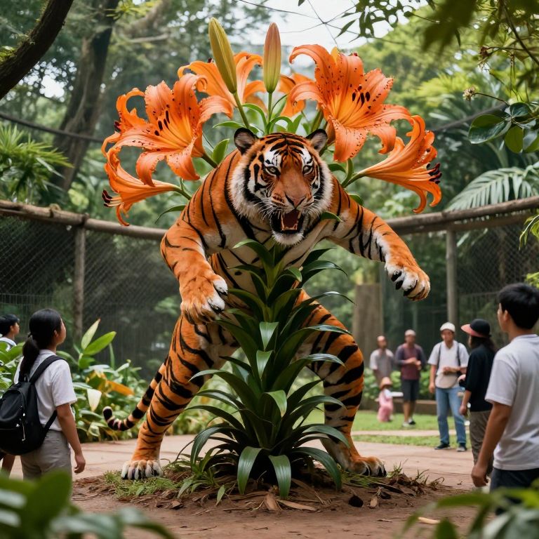 Double Exposure a massive tiger lilly plant monster, anthropomorphic, evil, attacking people in a zoo,