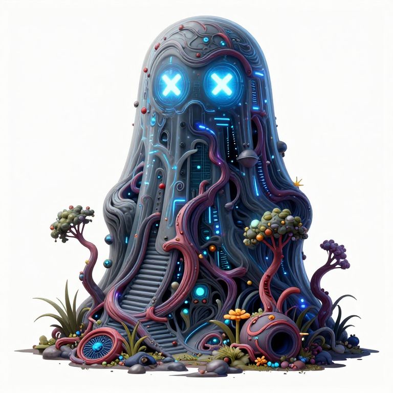 Architectural Drawing a cyberpunk holographic ghost, with x as eyes, detailed nature depictions, organic sculpting, dark colors, vibrant illustrations, kimoicore, ue5,