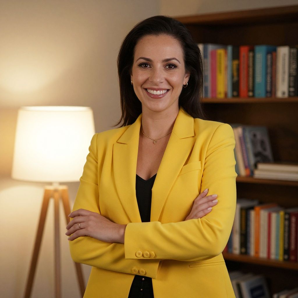 Photograph of a smiling woman with long dark hair, wearing a bright yellow blazer over a black top, standing with arms crossed. She has fair skin and wears subtle makeup with dark eyeliner. In the background, there is a warmly lit floor lamp and a bookshelf filled with colorful books. The scene is set in a cozy, well-lit room with warm tones, suggesting a professional or academic environment. The woman's confident pose and warm smile convey a sense of professionalism and approachability.