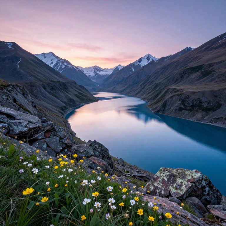 Photograph of a serene mountain landscape at twilight. A calm, reflective lake nestled between steep, rocky hills and snow-capped peaks. The sky transitions from pink to blue as the sun sets. In the foreground, yellow and white wildflowers bloom among green grass and dark rocks. The water's deep blue contrasts with the muted brown and gray of the hills. Snow patches on the distant peaks add a touch of white. The overall scene exudes tranquility and natural beauty, with sharp contrasts between the vibrant flowers and the rugged terrain.