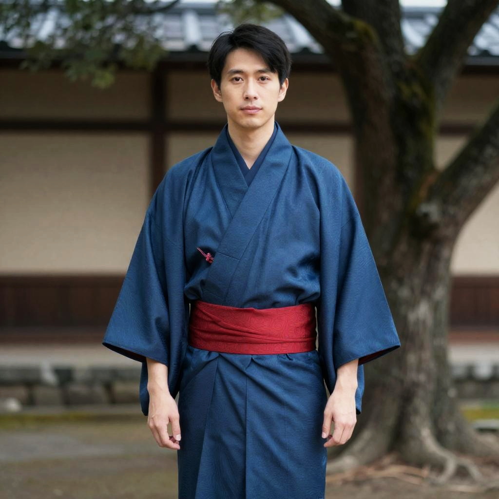Silk Yukata, man in a blue and red kimono standing in front of a tree
