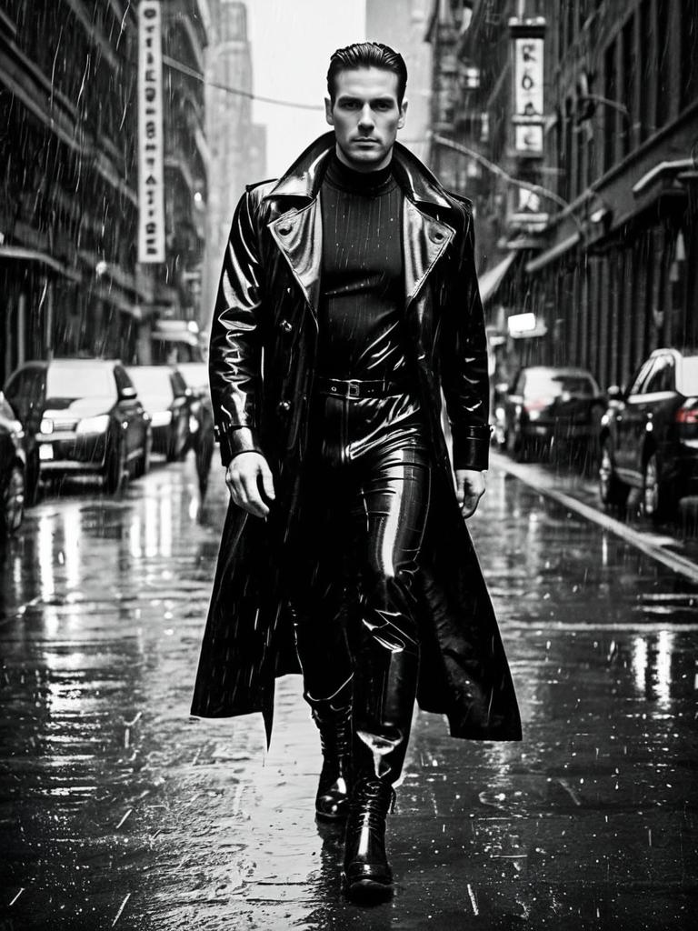 Image in the style of Film Noir Monochrome, suspenseful detective, slicked back dark hair, fit male figure, (Leather & Latex Catsuit:1.3), black leather trench coat, boots, rain soaked city streets studio background