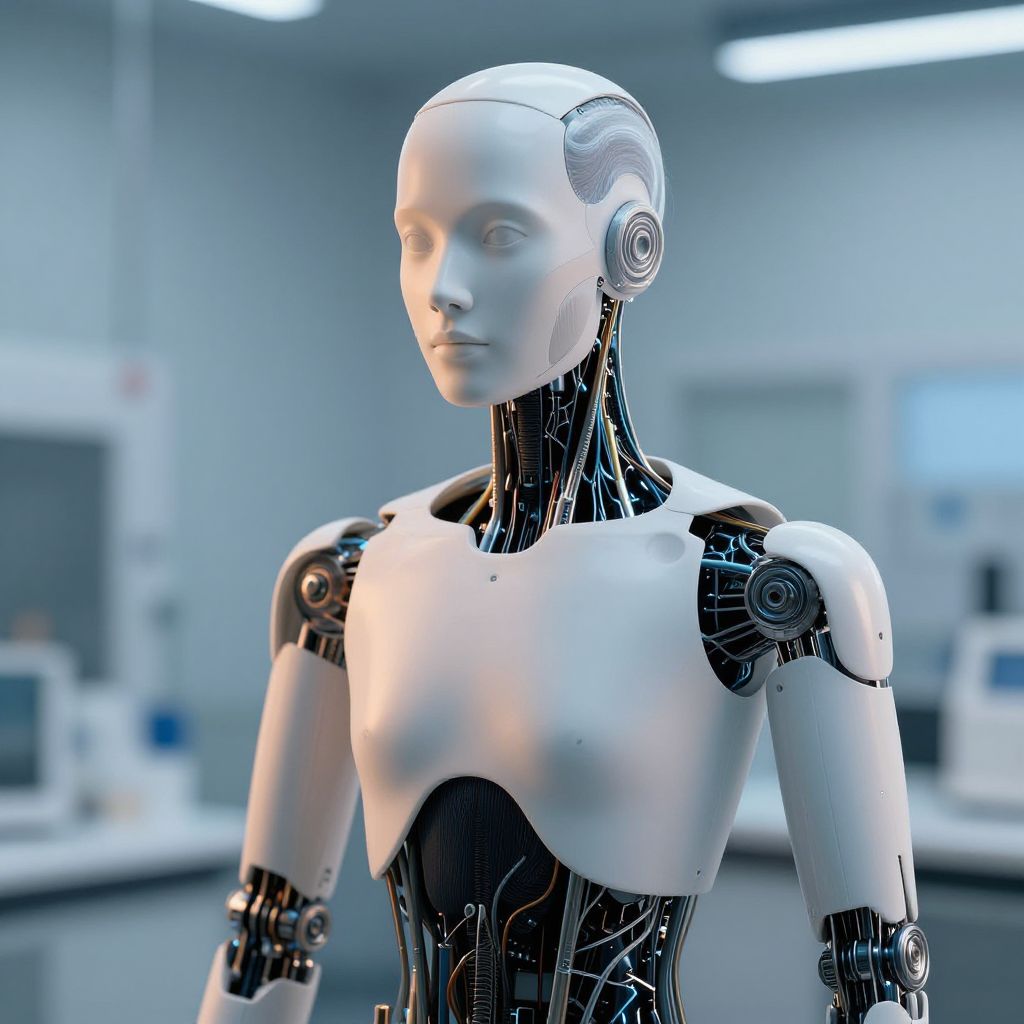 AI human generator visual depicting a humanoid robot in a serene laboratory setting, wires and neural networks integrated into smooth synthetic skin, subtle warm lighting highlighting intricate artificial muscles and synthetic hair, high-tech minimalistic environment