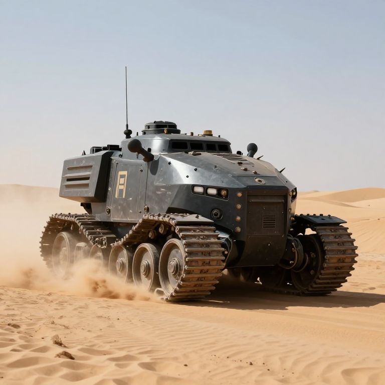 Photorealistic CGI of a sleek, black, six-wheeled, armored tank with large treads driving through a sandy desert under a clear blue