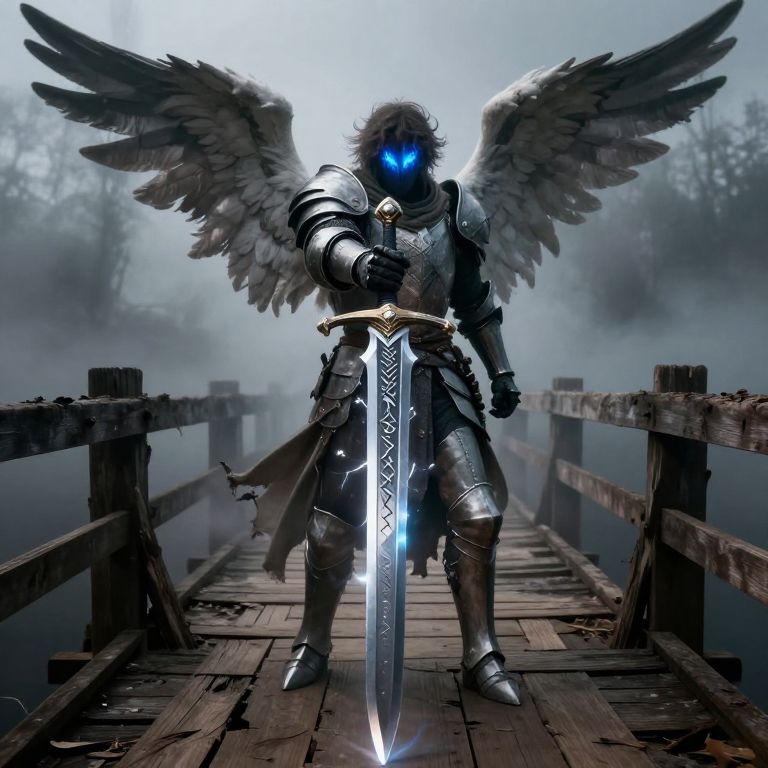 Digital painting of a dark armored angel with black wings and hood, glowing white halo in the background, exuding a mysterious, ominous presence.