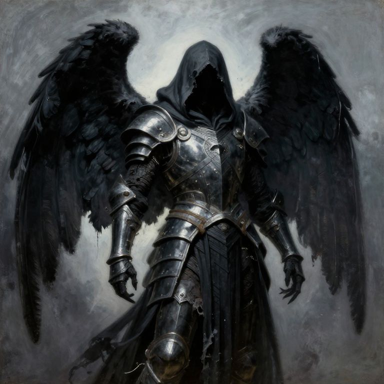 This digital painting depicts a dark, imposing figure of an armored angel with black, feathered wings. The figure is clad in shiny, metallic armor with a hood obscuring its face, adding a sense of mystery. The armor is detailed with intricate patterns and reflections, while the cloak flowing from the waist is dark and textured. The background is a blurred, gradient mix of gray and white, emphasizing the figure's dark silhouette and creating a dramatic, almost ethereal atmosphere. The overall style is dark fantasy, with a focus on gothic and mystical elements.