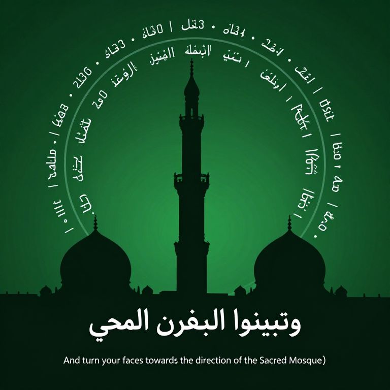 Digital graphic with a green gradient background featuring a black silhouette of a mosque with two large domes and a central minaret. White Arabic calligraphy encircles the top, with a smaller English translation at the bottom. The text reads, "And turn your faces towards the Sacred Mosque." The green gradient transitions from dark at the edges to lighter at the center, highlighting the mosque silhouette. The overall style is minimalist and Islamic-themed.